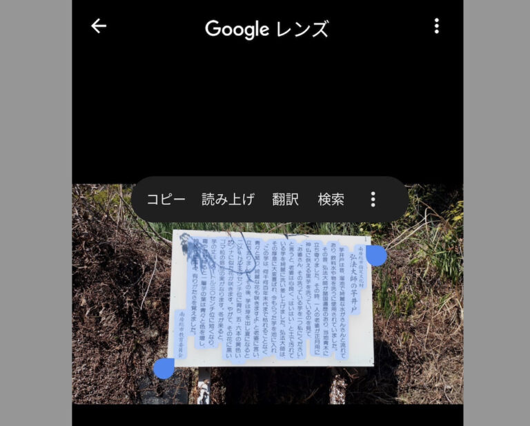 観光名所の看板などの文字を写真で撮っておけばGoogleレンズを使って数秒でテキスト化できます。